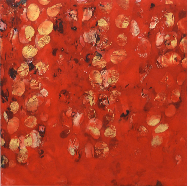 Encaustic (cosmetic grade beeswax), seawater (Atlantic Ocean), oxidized copper leaf, French red pale gold leaf 23 kt, aluminum leaf, lipstick, cinnabar, red lac, cadmium red deep, pigments and casein on floating birch panel (sold)