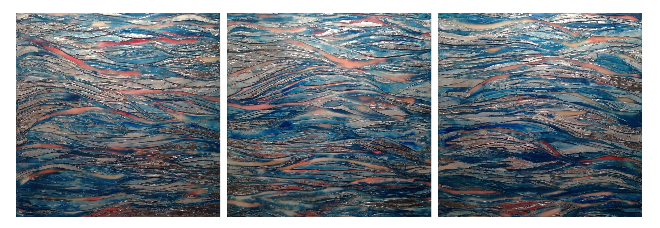Encaustic, water: Hudson River, eyeshadow: Sephora Color N° 13 Curacao Punch, Japanese coral, Chinese cinnabar, aluminum leaf, pigments and acrylic on floating birch panels