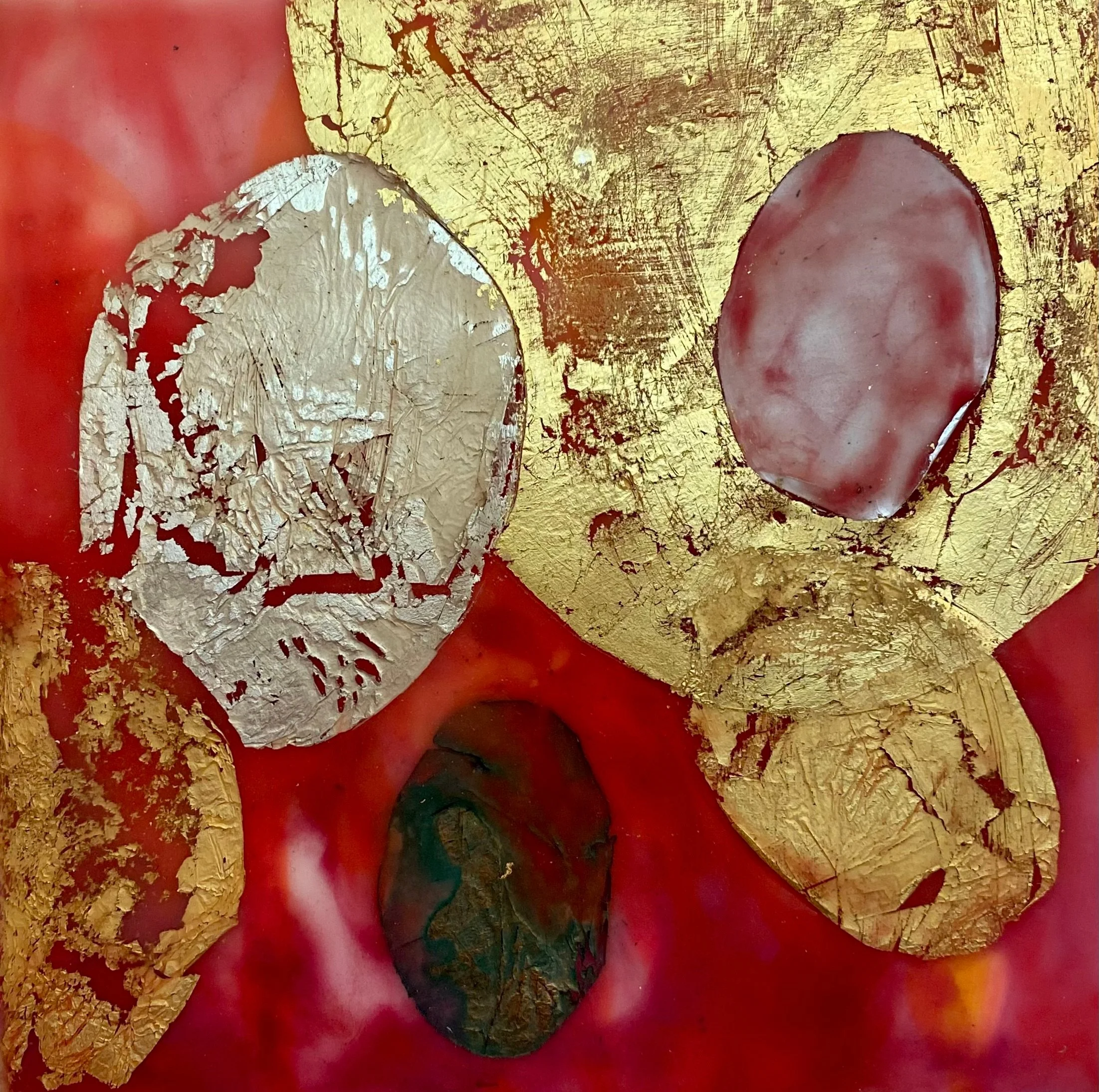 Encaustic, 22 kt. gold leaf, 16 kt. pale gold leaf, oxidizing copper & aluminum leaf, CHANEL Passion lipstick, cochineal, cinnabar, and pigments on wood each 8" x 8" x 3/4"
