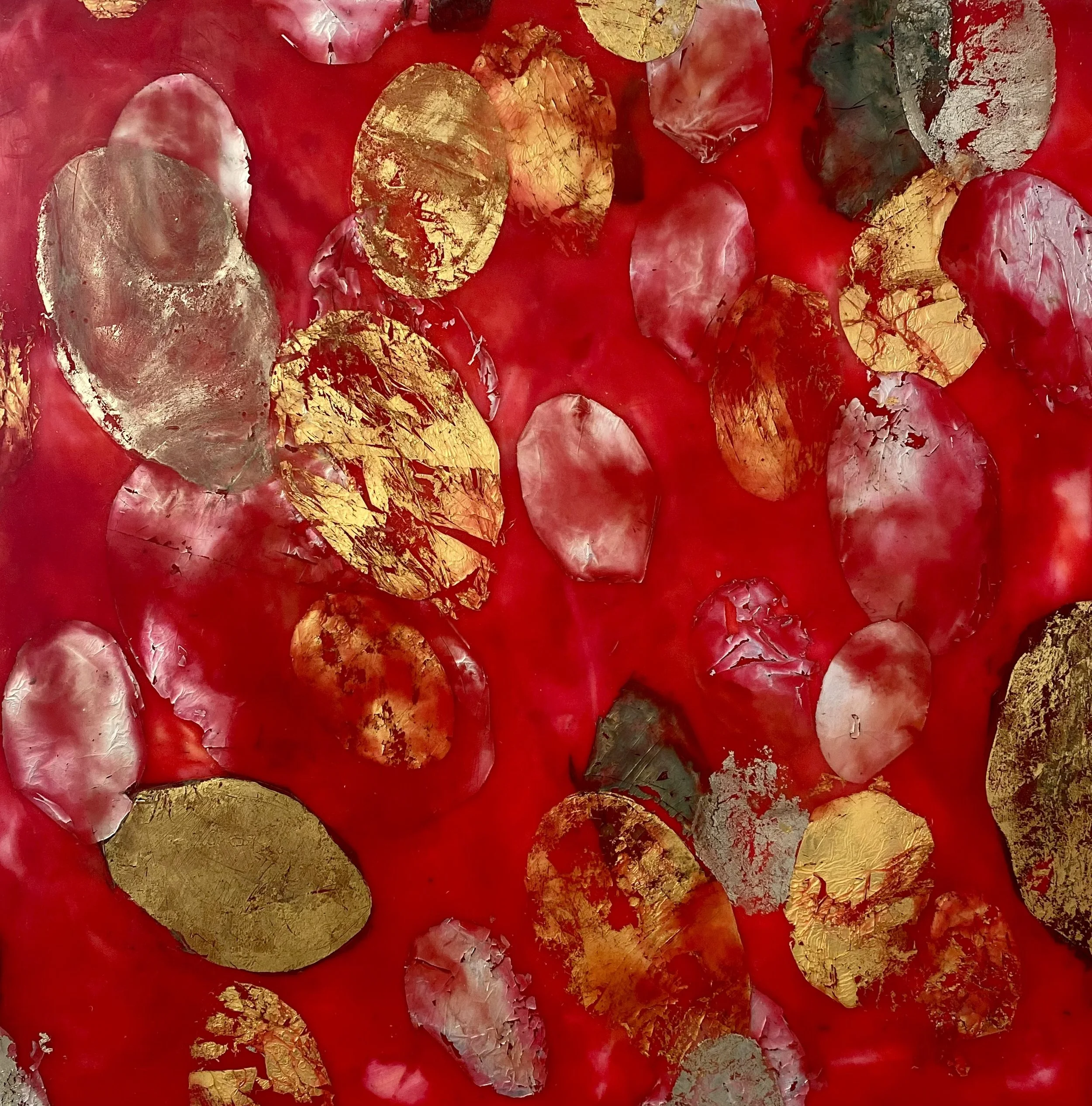 encaustic, 22 kt. gold leaf, 16 kt. pale gold leaf, oxidizing copper & aluminum leaf, CHANEL Passion lipstick, cochineal, cinnabar, and pigments on wood 20" x 20" x 1 1/2"