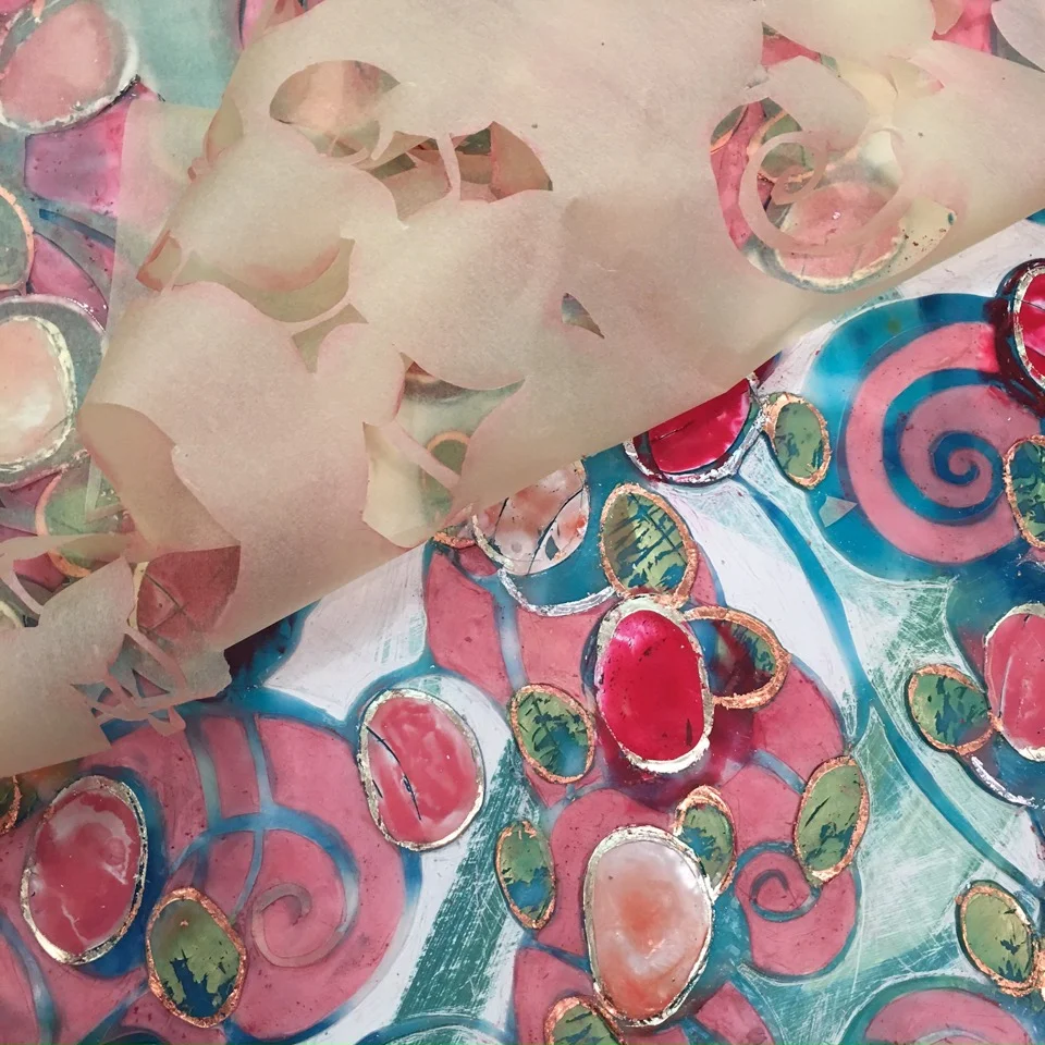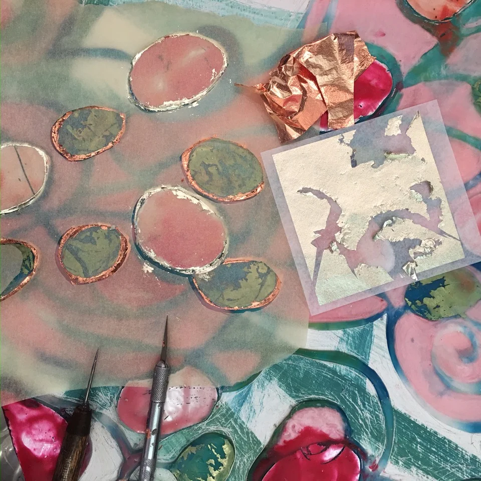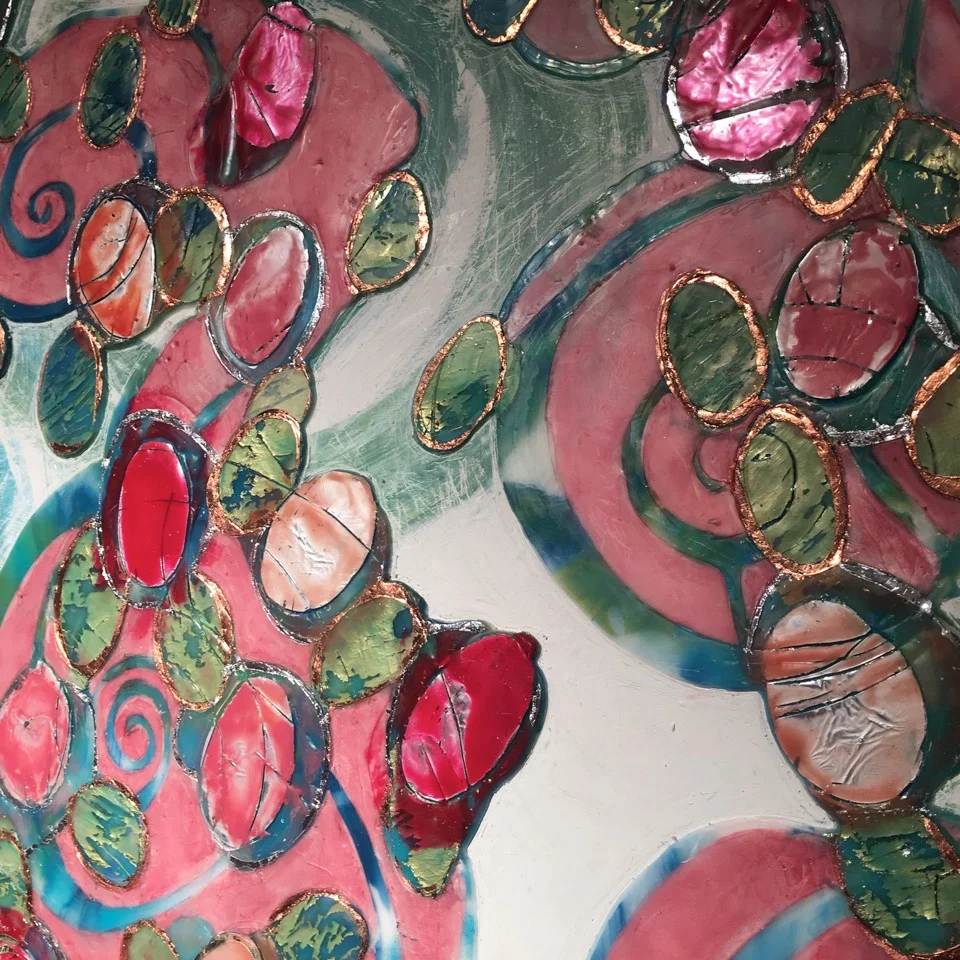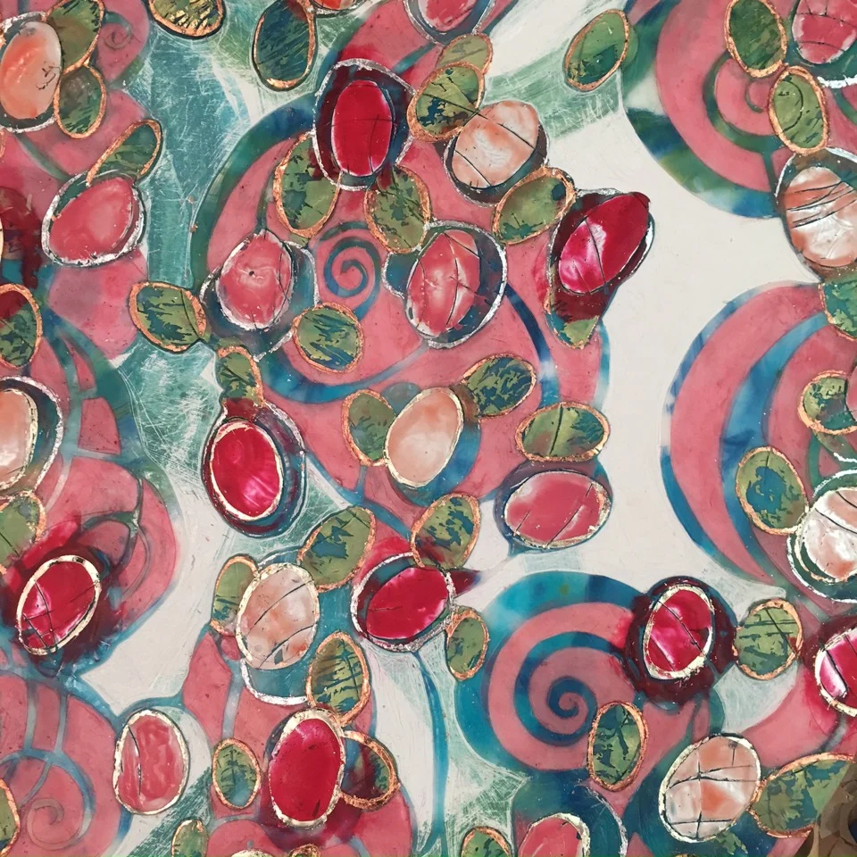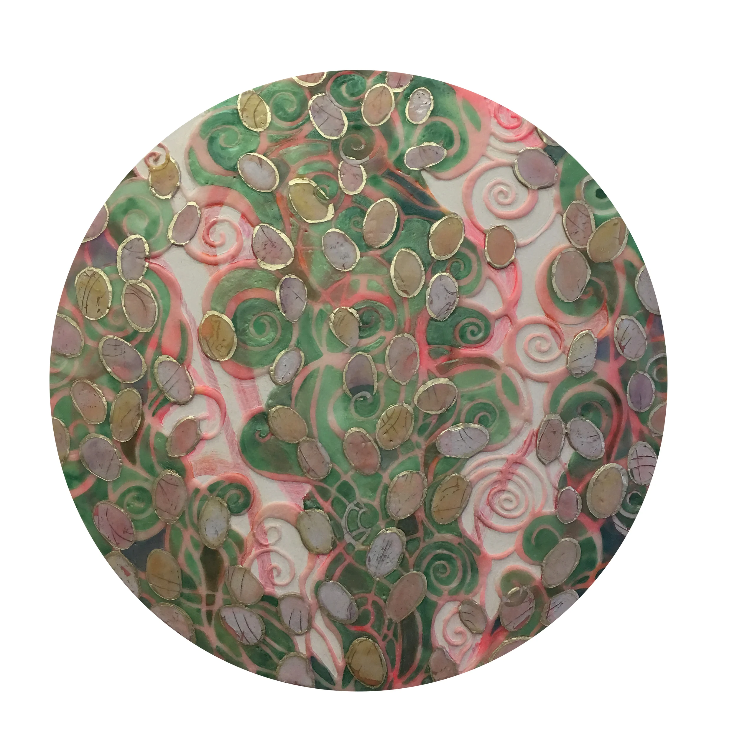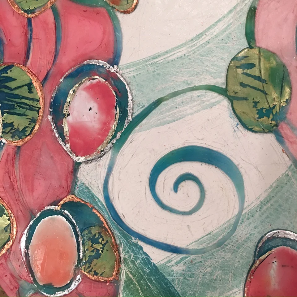 Encaustic, cosmetics : Dolce & Gabbana Bacio Blush and Dolce & Gabbana Rosa lipstick, oxidized copper leaf, 16 kt pale gold leaf, aluminum leaf, Japanese Iwamomo glass pigments, pigments, acrylic, rose oil from Turkey, and frankincense on birch floating panel 45 “ d