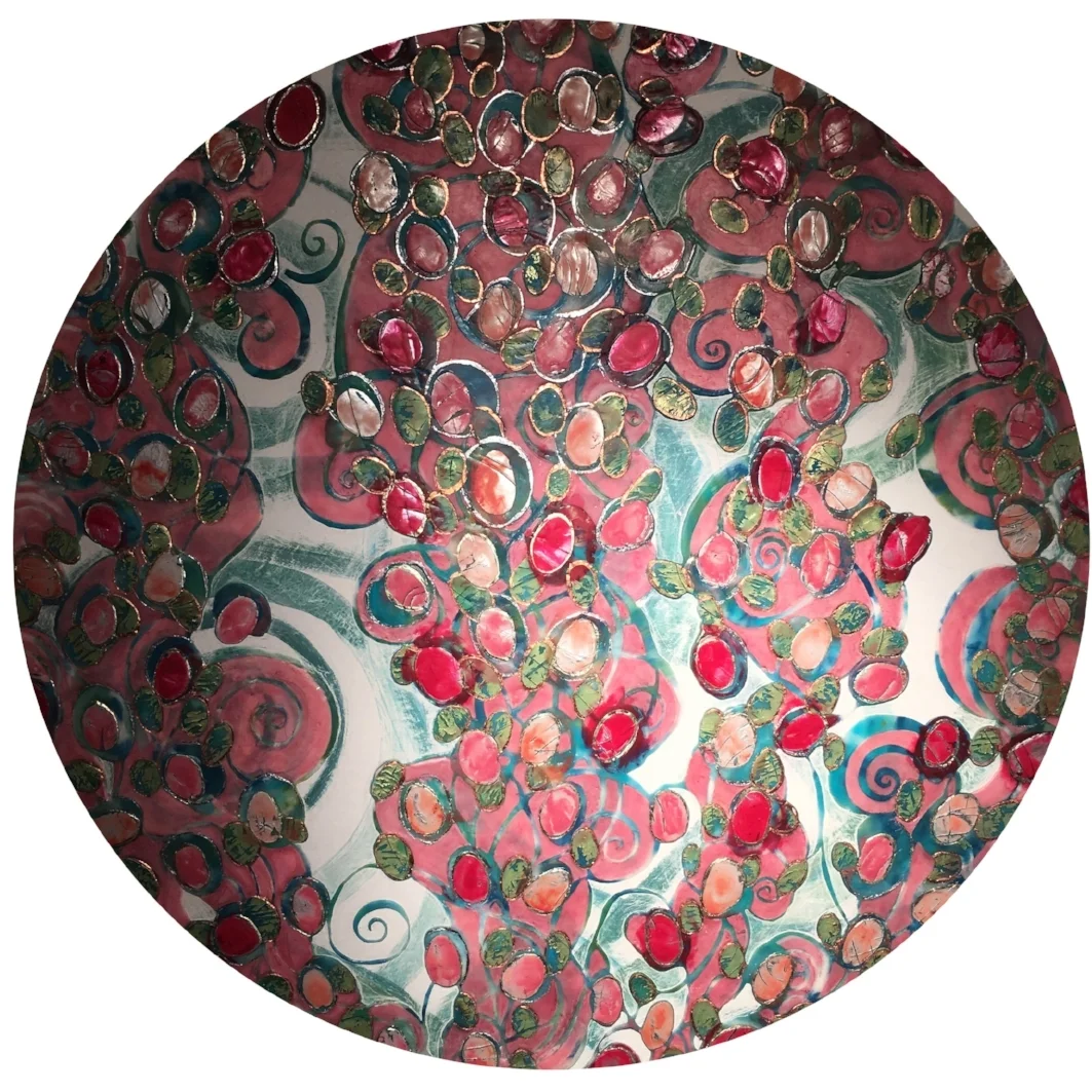 Encaustic, with MAC Love at First Bite 💄 lipstick, Chinese cinnabar, cochineal, pigments, aluminum leaf, oxidized copper leaf, and 24 kt gold leaf edged rim on birch panel 20” D