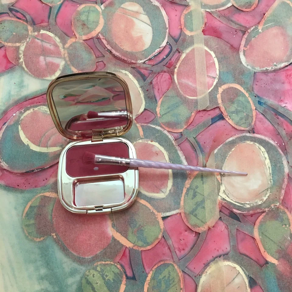 Encaustic , Bobbi Brown Peach Sugar and Twilight Pink eye shadows , Pale Pink blush and Tawny Brown bronzer, 16 kt pale gold leaf, Arabian Malachite, Japanese glass pigments, aluminum leaf, bee pollen, pigments, and acrylic on floating birch panel