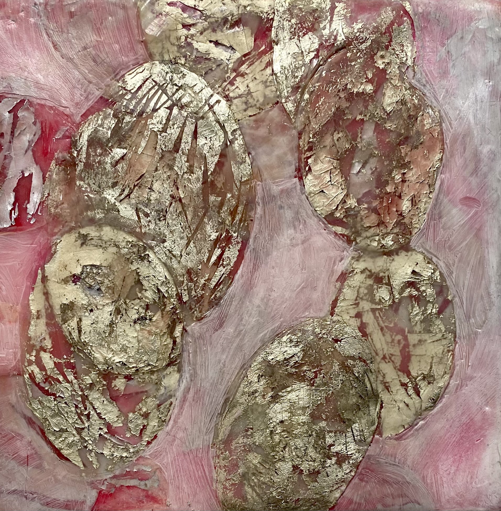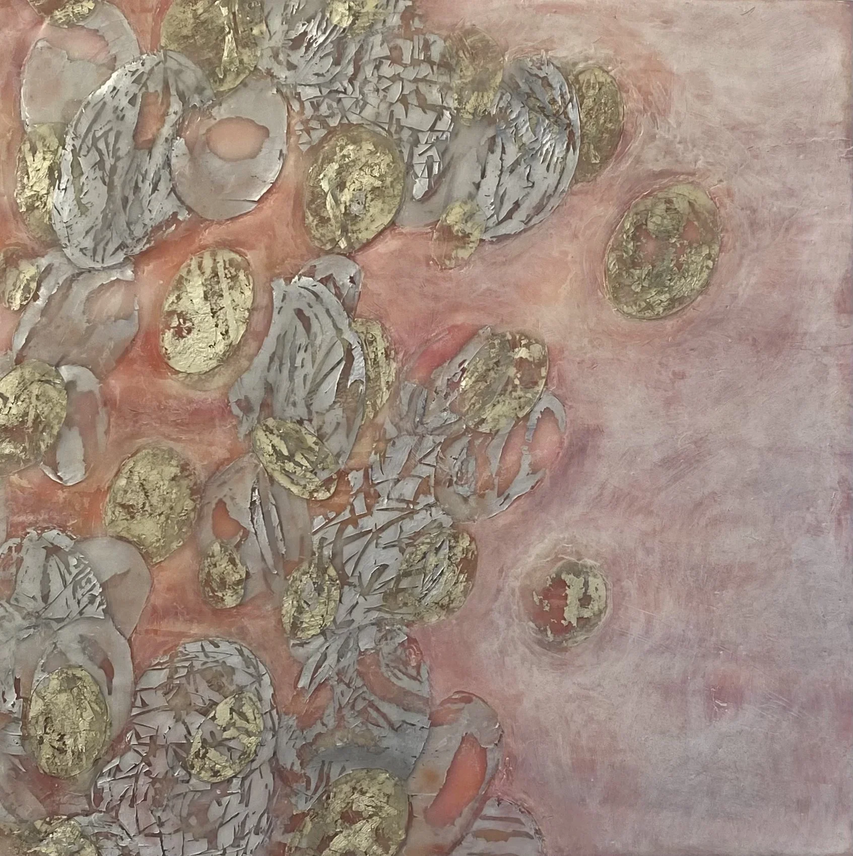 encaustic, crushed pearls, 16 kt pale gold leaf, Japanese coral, oyster shells, glass pigments, aluminum leaf and cosmetics on wood 18" x 18" x 1 1/2" (sold)