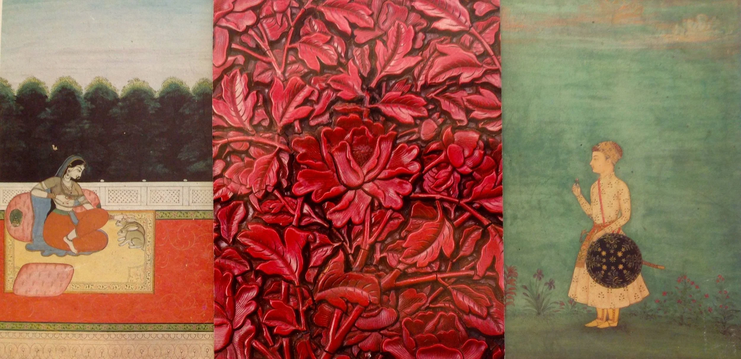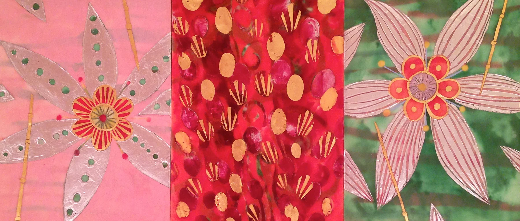 Encaustic (cosmetic grade beeswax), Arabian Malachite, Chinese Cinnabar, Lapis Lazuli (the center of the eye of the flower), Japanese Iwamomo glass pigments, Lipstick kiss: CHANEL 14 Passion lipstick, bee pollen, 24 kt gold leaf, aluminum leaf and sandalwood oil on birch panels